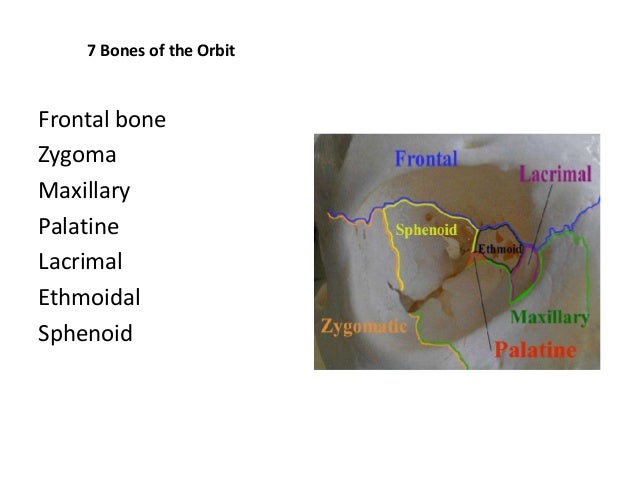Orbitan (ögonhålan) består av 7 ben: os frontale, os lacrimale, os ethmoidale, os zygomaticum, os palatinum, os sphenoidale och os maxilla.